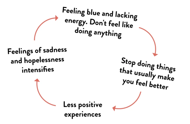 The biggest difference between depression and regular sadness is that the depressive symptoms don’t go away as you would expect them to. You feel down all the time, have little energy and difficulty enjoying the things you usually like. These experiences can get you stuck in a vicious cycle. Because you don’t feel like doing anything, you stop doing the things that usually make you feel better. Then, you start missing out on positive experiences, which makes you feel even worse. And the cycle keeps spinning. Like this: