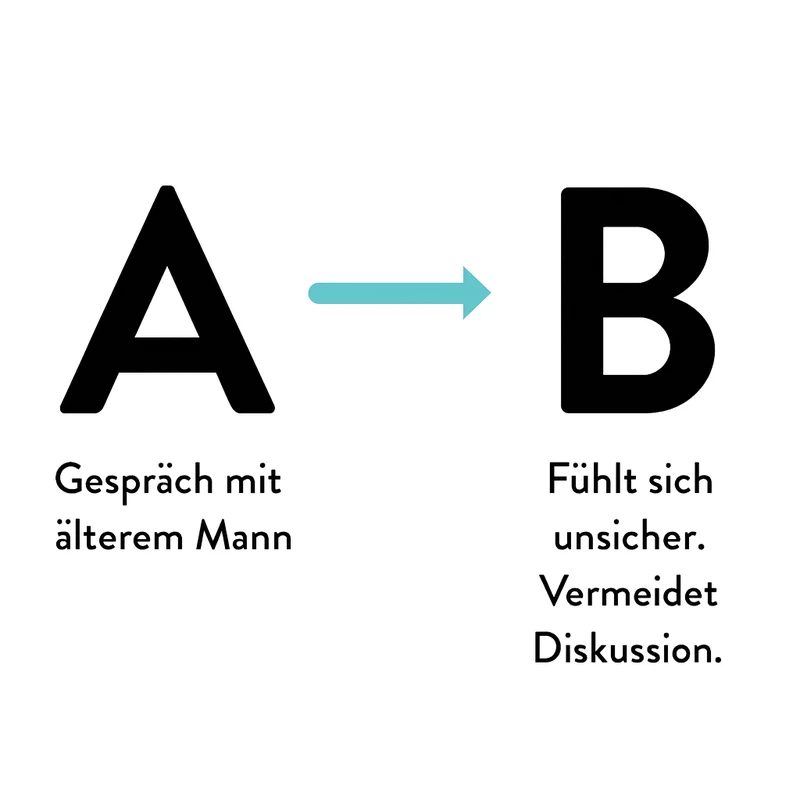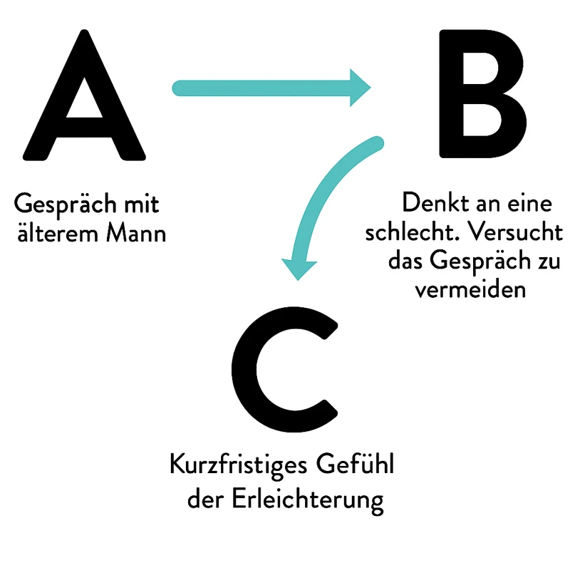 Das ABC-Modell kann uns helfen, Sarahs Handlungen zu verstehen. Es erklärt uns, warum ein Verhalten auftritt. Das A in ABC steht für Antezedenz (Auslöser). Es bedeutet, dass bestimmte Situationen uns dazu bringen, auf bestimmte Weisen zu denken, zu fühlen und zu handeln, basierend auf unseren vergangenen Erfahrungen. Wenn Sie zum Beispiel letzte Woche von einem Hund gebissen wurden, würde der Anblick eines Golden Retrievers Sie vielleicht zusammenzucken lassen. Wenn Sie nur schöne Erfahrungen mit Hunden gemacht haben, würden Sie vielleicht anders reagieren. Jedenfalls löst das A bei uns eine bestimmte Reaktion aus, zum Beispiel die Reaktion auf einen Golden Retriever. Das B ist, wie wir handeln, zum Beispiel Angst empfinden und springen. Es ist, als wären wir darauf programmiert, auf eine bestimmte Weise zu handeln, wenn etwas Bestimmtes passiert. In Sarahs Fall assoziierte sie das Sprechen mit einem älteren Mann (A) mit dem Gefühl der Unsicherheit und dem Vermeiden der Diskussion (B).